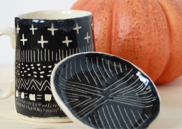 Carve a handmade mug and learn the art of sgraffito! Not only will you get to design a mug and ring dish in a fun unique way, but you’ll learn all about the tools potters use to decorate their pots. This workshop is a fresh take on a traditional technique! We'll be using a rich velvet black underglaze on porcelain clay-the same materials I use in my studio every day! After the event, your wares will be glazed and ready for pick up by October 15, 2018.