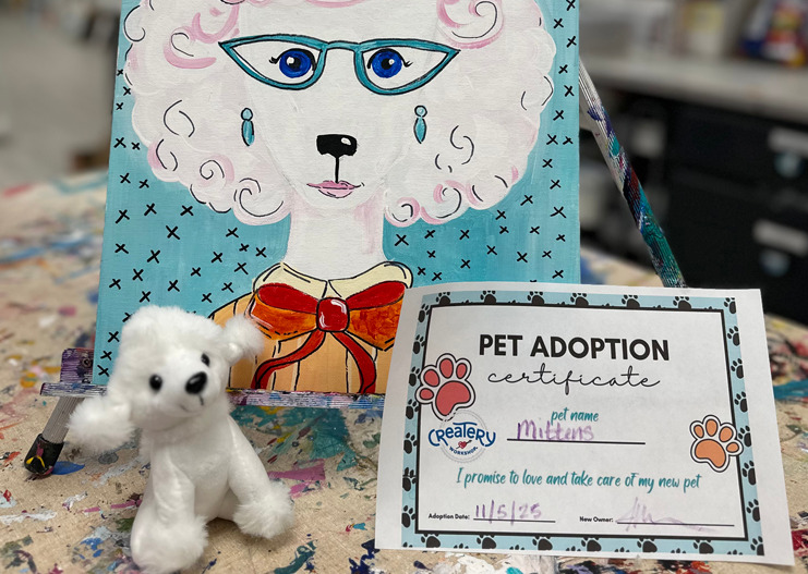 Join us for a snuggley Pet adoption party! We will create a pet "self-portrait" and adopt a little mini cat or dog. We not only paint, but we will add mix media,... more